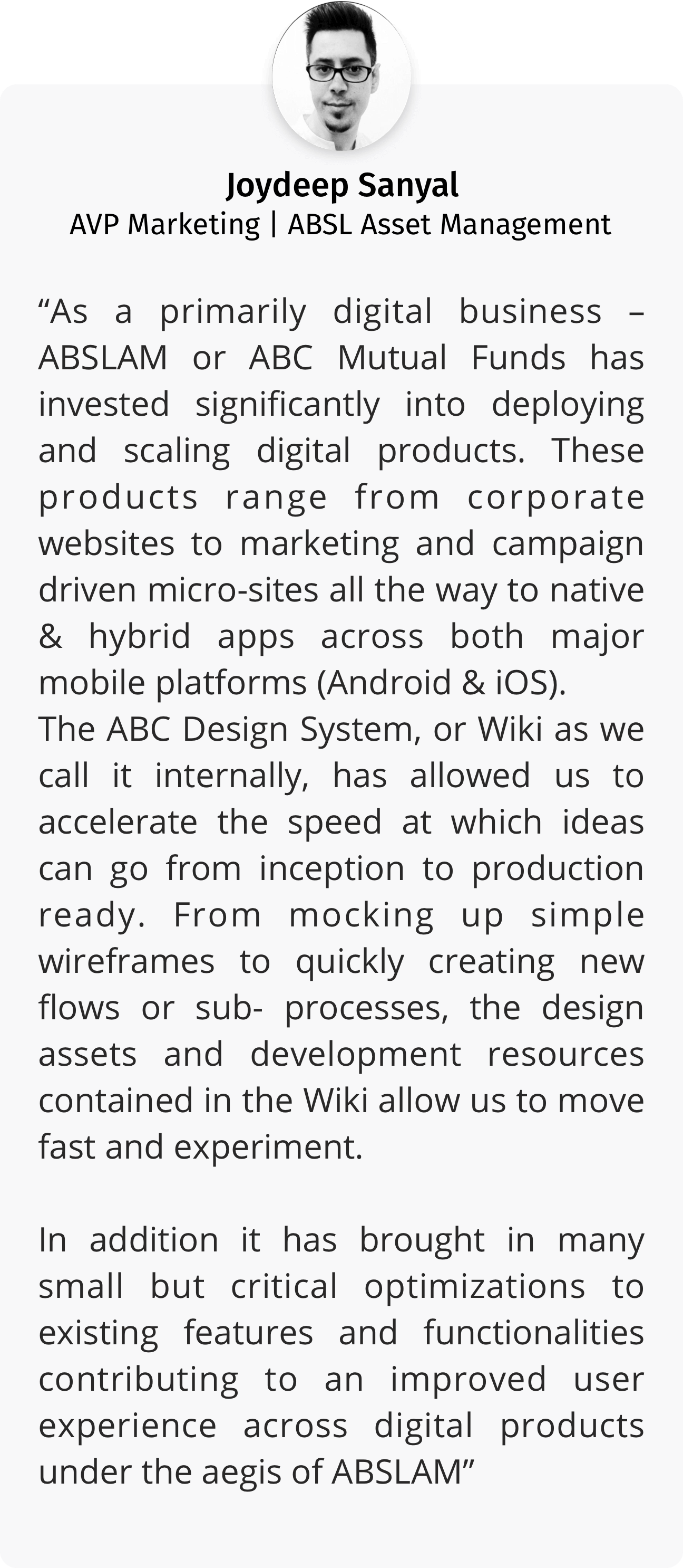 This product to make products allowed teams to bolt from idea to implementation much quicker than ever. Half the job was always ready to pick from.It had the added benefit of also unifying the look and feel of ABC’s digital products – helping project the ‘One Brand for All Your Financial Needs’ philosophy behind Aditya Birla Capital.